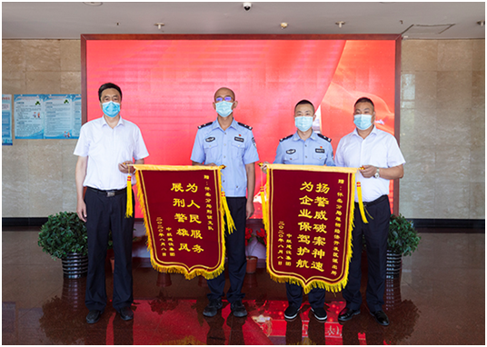 培训中心主任孔德明代表好博最新网页登录向怀柔分局雁栖经济开发区派出所所长和怀柔分局刑侦支队支队长送上锦旗,代表公司感谢人民警察服务企业生产建设、守护一方平安付出的艰辛努力,感谢怀柔分局雁栖开发区派出所和怀柔分局刑侦支队急企业所急、想人民所想,在企业遇到困难时及时出警,有力保障了企业财产安全,维护了社会良好秩序,为企业发展创造了平安和谐的营商环境。