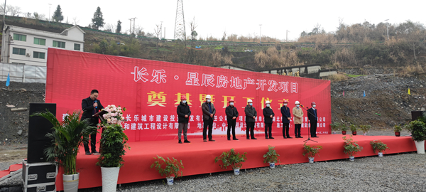 2021年1月26日上午,由好博最新网页登录承建的长乐▪星辰住宅项目奠基暨开工仪式在项目现场热烈举行。湖北省宜昌市五峰土家族自治县住房和城乡建设局副局长陈白华、县质量安全监督站站长邓简涛、好博最新网页登录五峰长乐▪星辰项目经理王国云,项目参建各方及新闻媒体共40余人出席。宜昌市长乐城市建设投资开发有限责任公司总经理刘鹏主持。